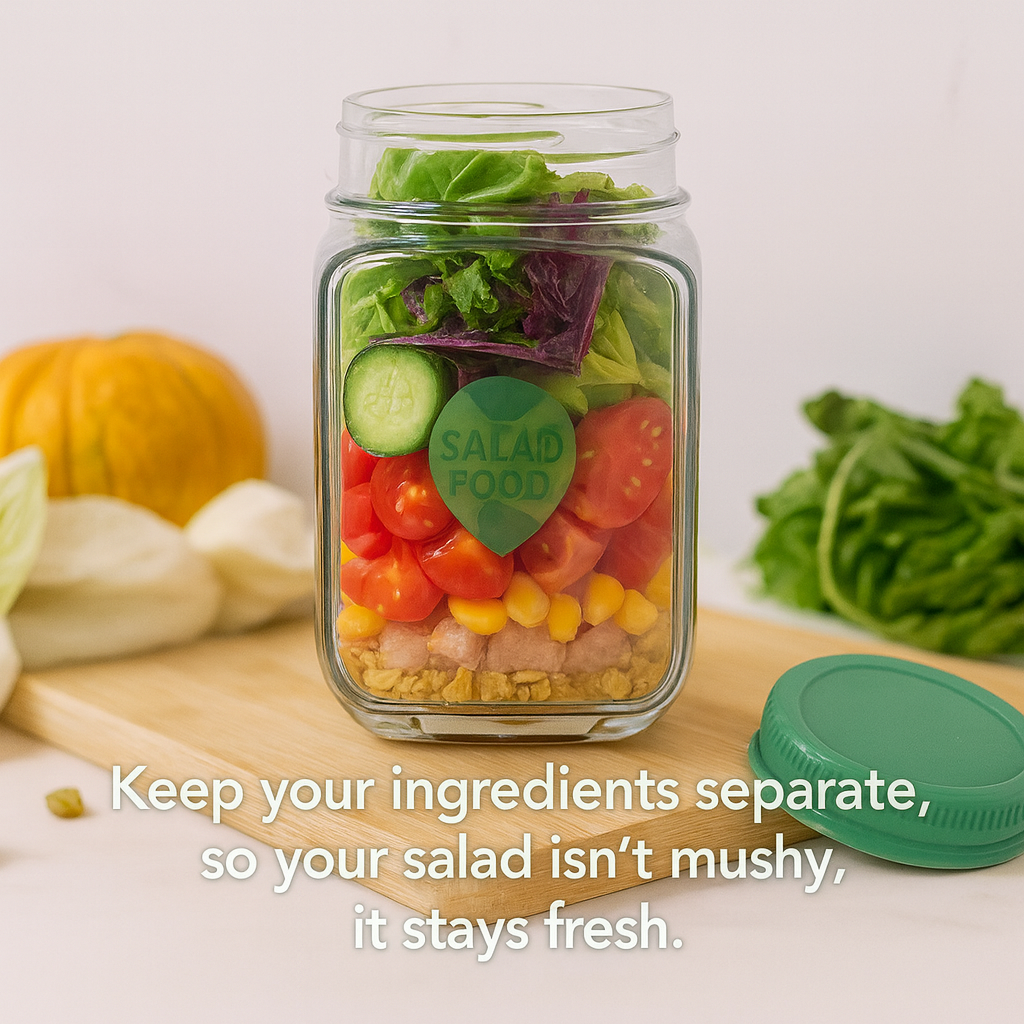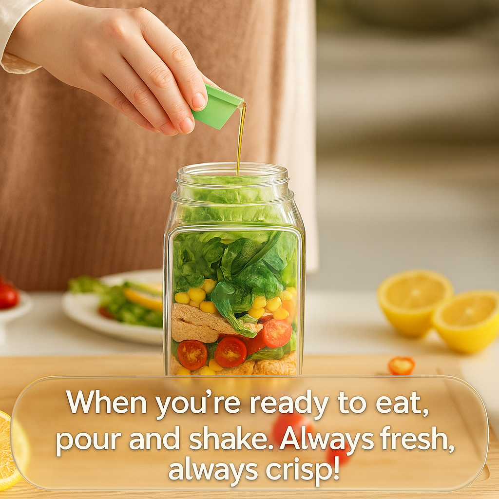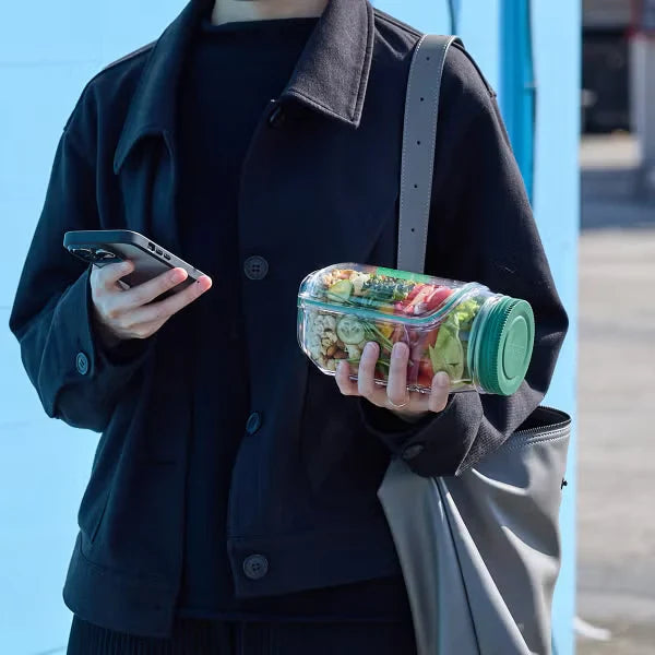 Dank intelligenter vertikaler Stapelung berühren sich nasse und trockene Zutaten nicht. Der separate, dichte Saucenbehälter hält deinen Salat bis zum Verzehr frisch und knackig — Schluss mit matschigem Salat.
