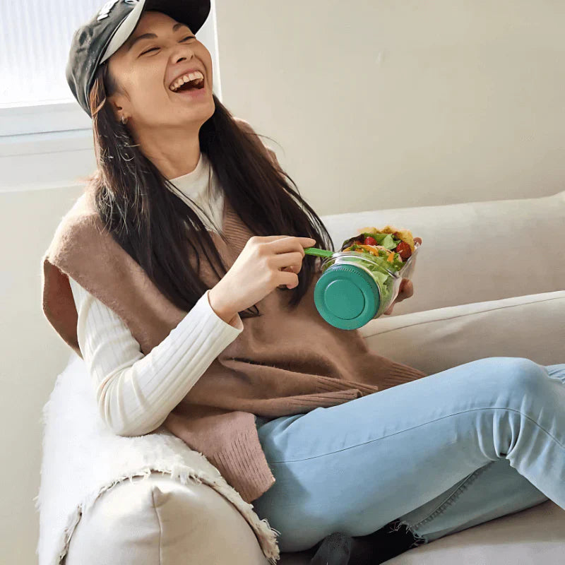 Das Ergebnis? Ultrafrische und leckere Salate — im Büro, in der Schule oder unterwegs, ganz unkompliziert und auslaufsicher.