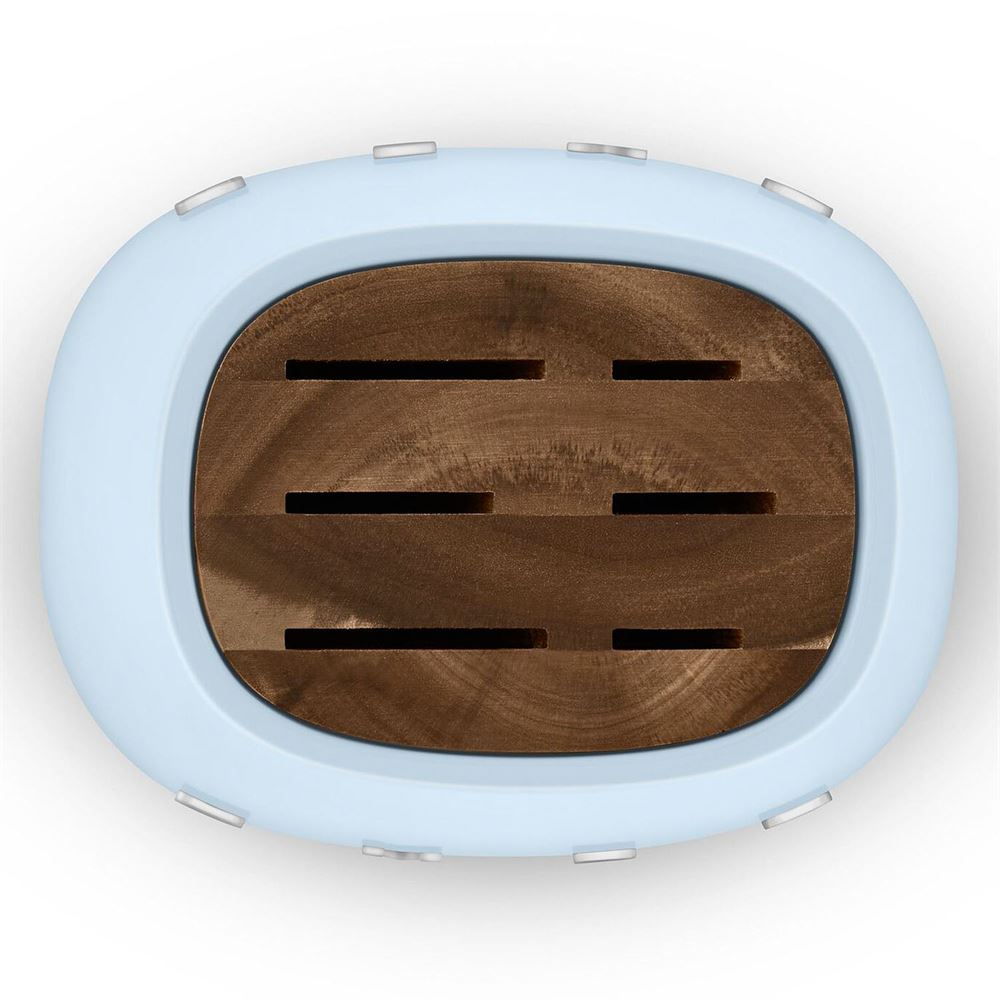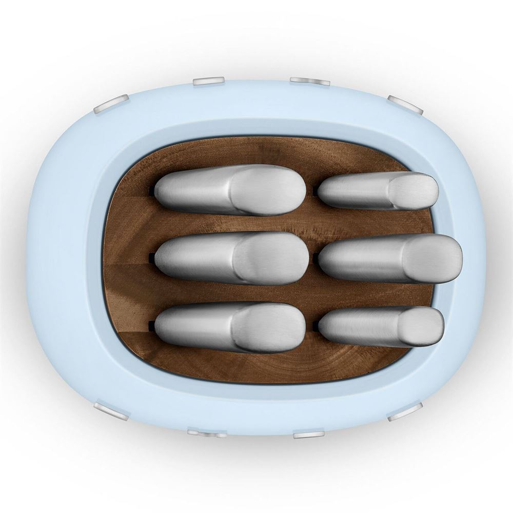 Das SMEG Messerblock-Set verfügt über einen eleganten Block aus Akazienholz mit einem robusten, pulverbeschichteten Karbonstahlrahmen und einer rutschfesten Unterseite für maximale Stabilität.
